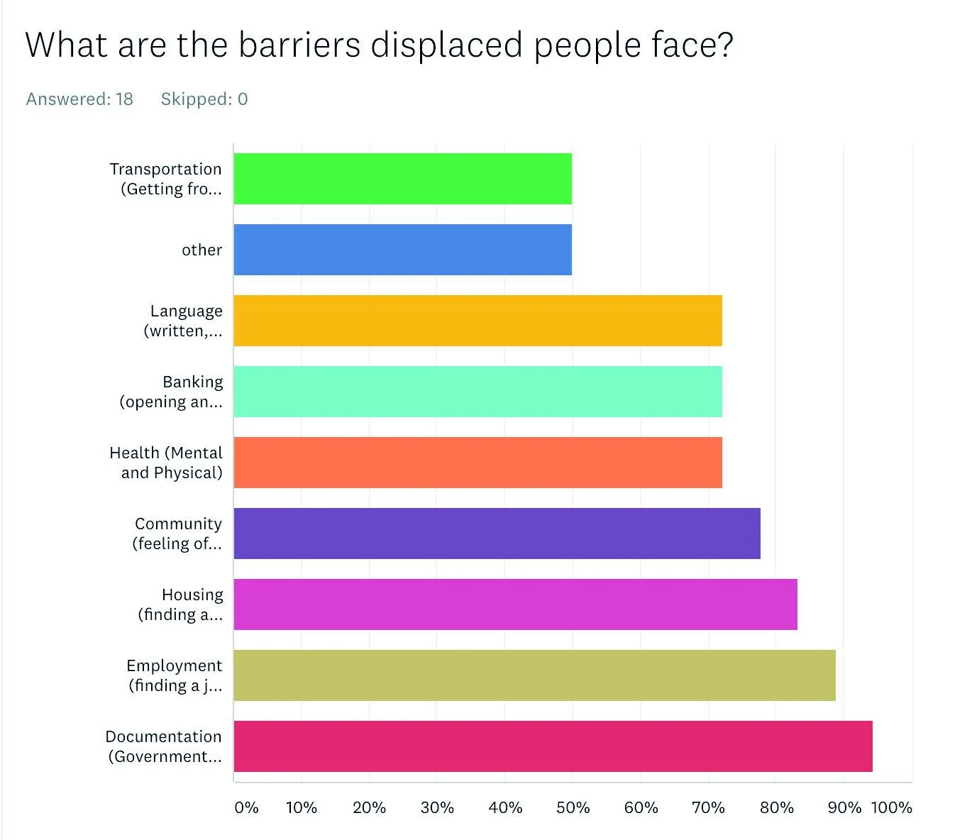 Survey Results for the barriers refugees face, and the services they would like to see.
