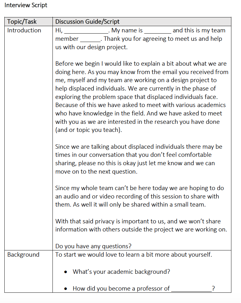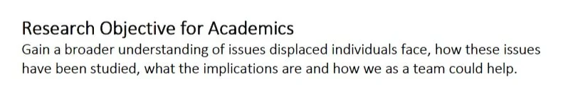 The team hoped that by talking to experts first, we would gain knowledge of what language to use when speaking to displaced individuals. Those who may be concerned a vulnerable sector in research.